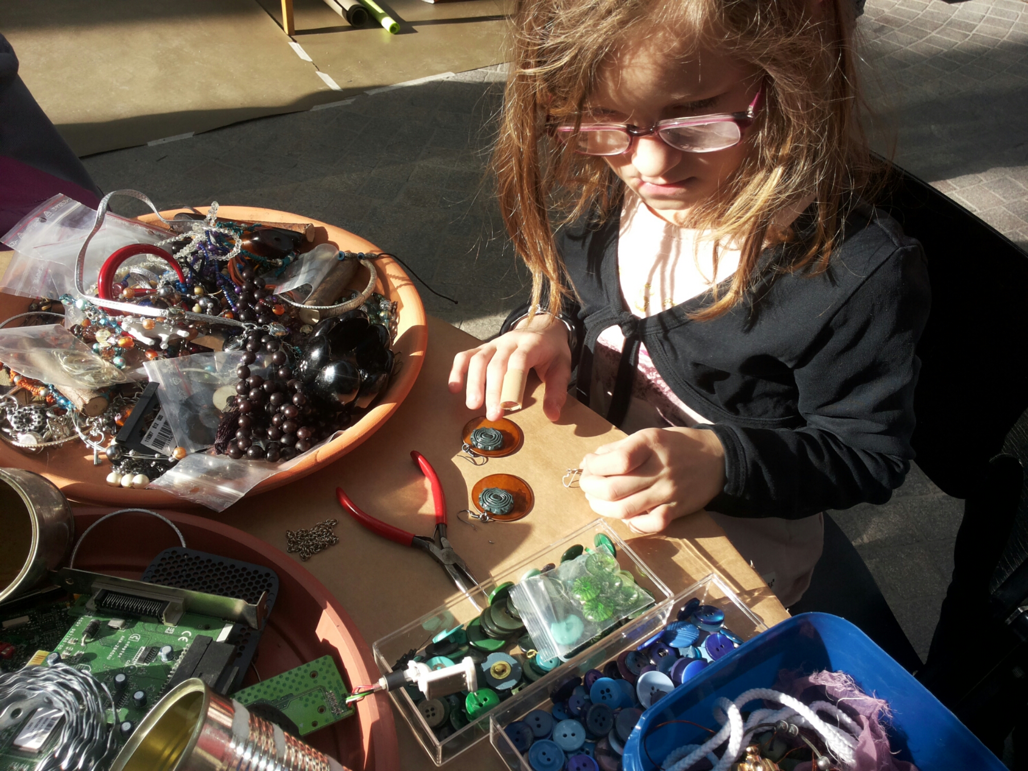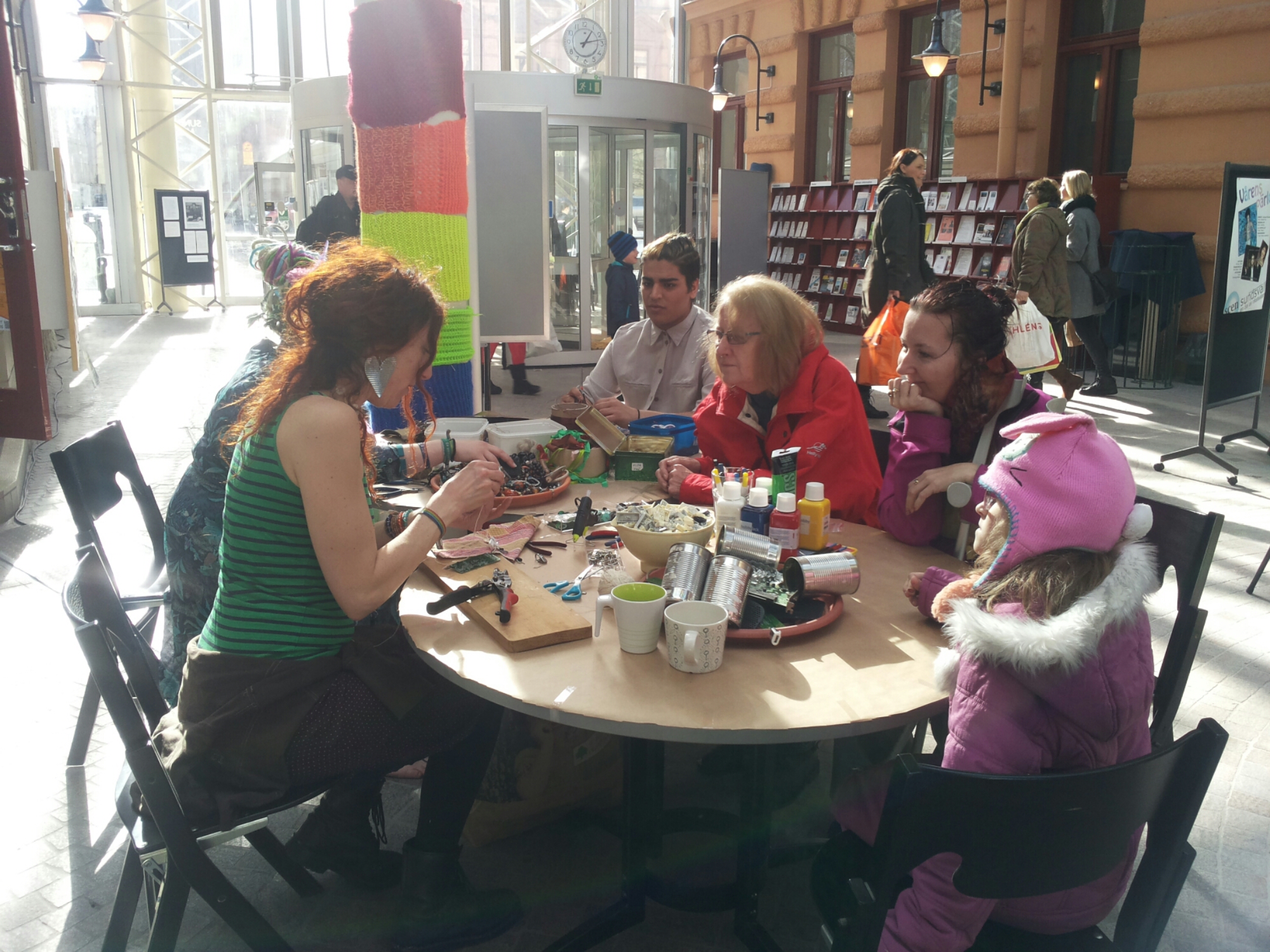 We gathered a bunch of old jewelery, left over pearls, fabrics and what not that we and our friends had. An industrial company donated metal for us and the café ungamagasinet bought some tools and useful stuff. We made new jewelry from old stuff, upcykling in other words!!! We had a lot of fun and the kids loved it, so did the grown ups 😉